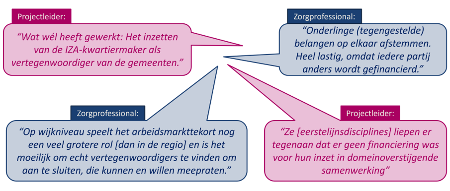 Zorgprofessional: 'Onderlinge (tegengestelde) belangen op elkaar afstemmen. Heel lastig, omdat iedere partij anders wordt gefinancierd'.